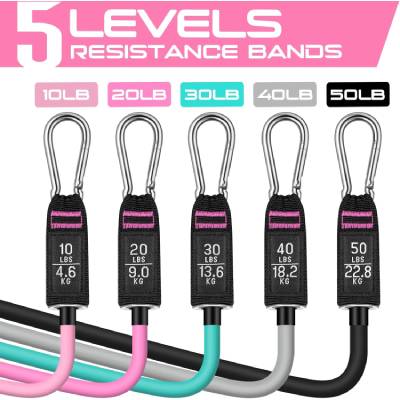 The RENRANRING Resistance Bands Set features 5 color-coded bands that can be used individually or stacked together to create a maximum tension of 150 lbs.